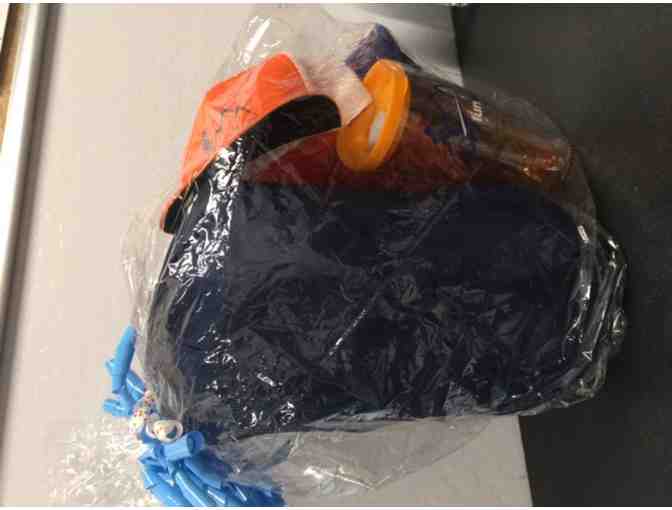 A basket of goodies from Apex Fun Run: a frisbee, baseball hat, sleeping bag; and insulated tumbler.