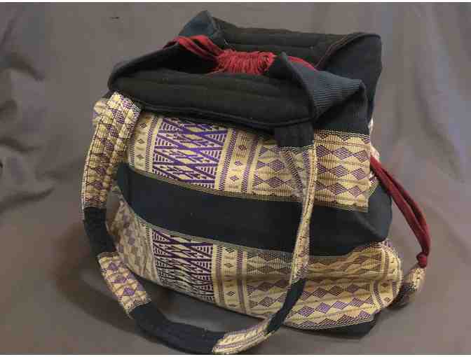 This hand woven bag comes from the banks of Inle Lake. It is one of those bags that will fit all the things you want to carry! The bag has large side pockets and a very large center section with drawstring pulls. The interior is red with lots of compartments for smaller items.