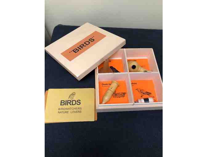 Wooden Box of bird whistles with instructions on use and recognizing calls.