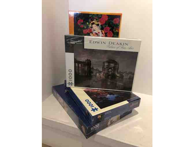 Four 1000 piece jigsaw puzzles (Edwin Deakin - Palace of Fine Arts and the Lagoon, Haruyo Morita - Tsukaki, Maxfield Parrish - The Mill Pond, Octavio Ocampo - Double Vision)