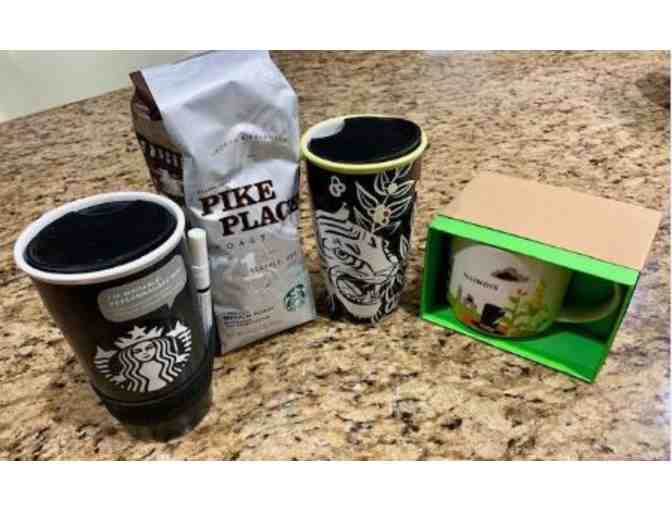 Have your Starbucks at home with this gift set. The set includes one pound of whole bean Pike Place coffee, one Illinois Starbucks coffee mug, one travel Starbucks coffee cup with tiger design and one personalizable Starbucks travel cup.