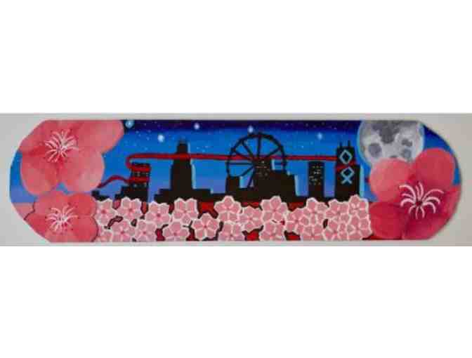 Artist's Statement: My skateboard design shows the silhouette of Chicago overflowed with Japanese inspired "Sakura", also known as cherry blossom flowers. They are tied together with a red ribbon, representing Chinatown on a starry night.