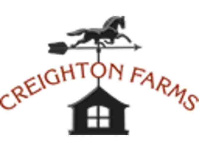 An 18-hole round of golf for four with carts at Club at Creighton Farms (award-winning Jack Nicklaus Signature course) in Aldie, VA. Golf appropriate attire required. Available Tuesday through Thursday. Call Robert Blumer at 703-957-4807 or rblumer@creightonfarms.com to make arrangements in advance for your visit. Based on availability. Some restrictions and blackout dates may apply. Certificate expires September 30, 2019. Visit www.creightonfarms.com