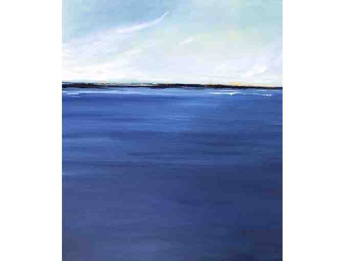 “Blue waters” is an original 30x40 acrylic abstract on canvas by Blue Day Art. Custom finished in a black wood floating frame. A thin gold band on the frame picks up the subtle gold leafing in the distant horizon.