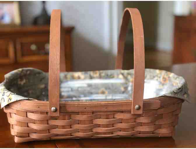 Retired Longaberger basket- oval handled basket, cloth liner and plastic protector.