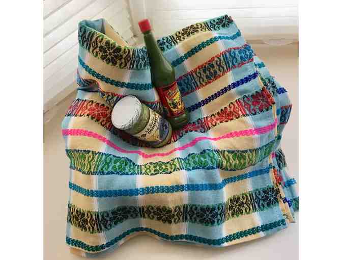 Beautiful Guatemalan tablecloth and Guatemalan hot sauce and chimichurri sauce.