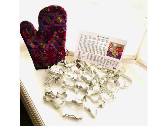 Tons of (approx) 3" cookie cutters with beautiful Guatemalan oven mitt and recipe for CHAMPURRADOS, a Guatemalan specialty. Cookie cutters include cat, dog, dog bone, butterfly, flowers, dragonfly, and many more.