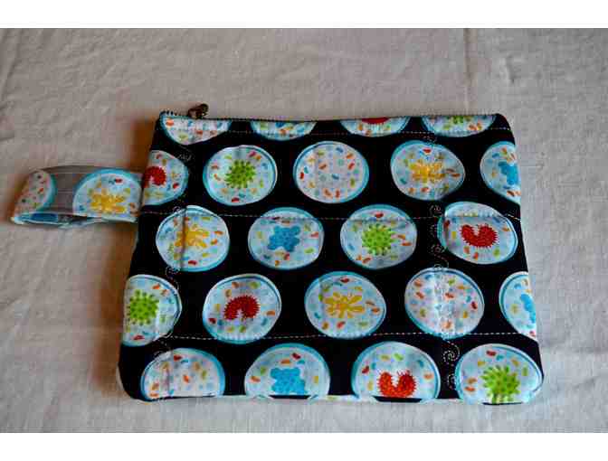 A 6" X 7.5" black petri dish pattern pouch with carrying loop metal zipper, handmade by Mrs. Yanashima.