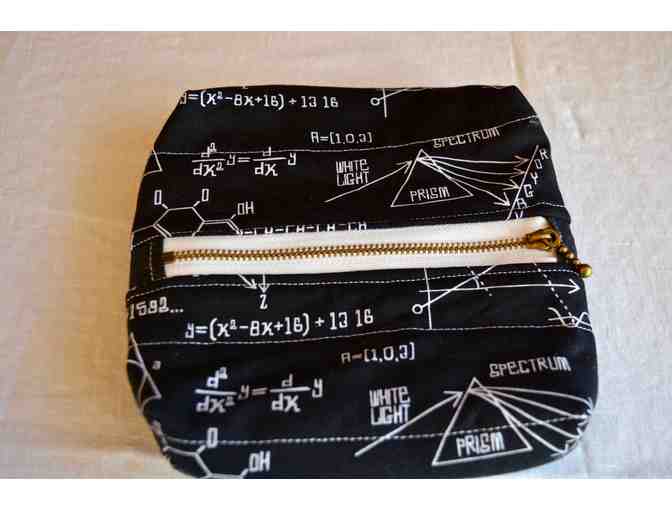 A 7" x 7" black science icons pouch with metal zipper, handmade by Mrs. Yanashima.