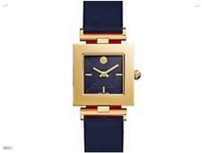 Look glamorous in this Tory Burch watch. Blue and Red Sawyer gold-tone 25/25mm Twist Watch MSRP. It is Swiss made. Inspired by vintage jewelry, color, art and travel. Our latest womens watches designed with signature elements, from fretwork details to saffiano leather straps and the iconic logo.