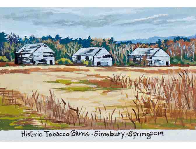 Simsbury Tobacco Barns in gauche on watercolor paper. The painting is 5x7 framed to 11x14.