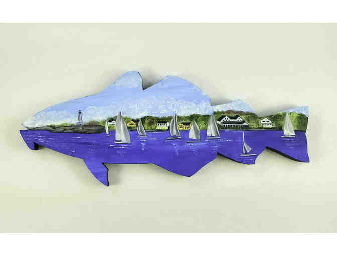 Marblehead has many scenic landscapes. It seems fitting to paint one of them on this beautiful cod. This is an oil landscape of sailboats with Marblehead Light in the distance.
