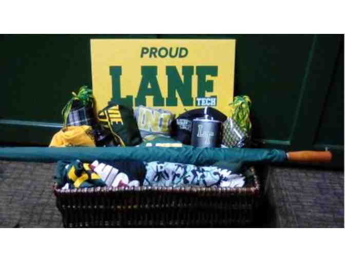 Here's your chance to get your Lane pride gear with this basket of assorted Lane t-shirts, sweatshirts, one of a kind school store items, dry fit shirts from the athletic department, shirts from sports, drama, guitar, computer science plus other fun surprises!