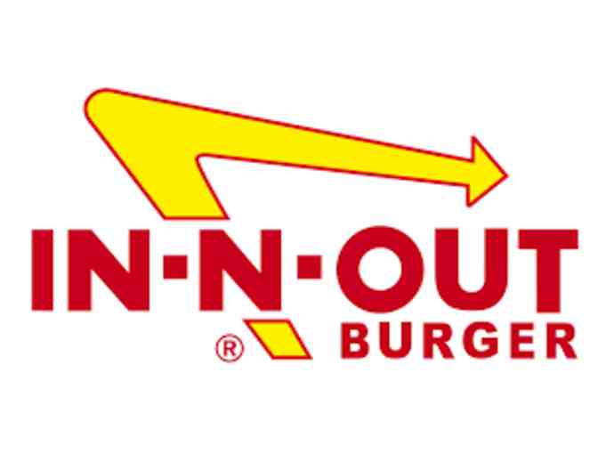 IN-N-OUT Burger gift pack contains gift cards for four burger meals and logo items including an adult T-shirt, plastic water cup, hat, pencil, and notepad.