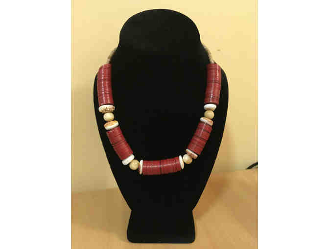 This unique necklace is made from recycled records(!) from Africa, tumbled abalone and wooden beads. This is a conversation piece and definitely makes a statement. The bold red of the records is striking and will dress up any ensemble.