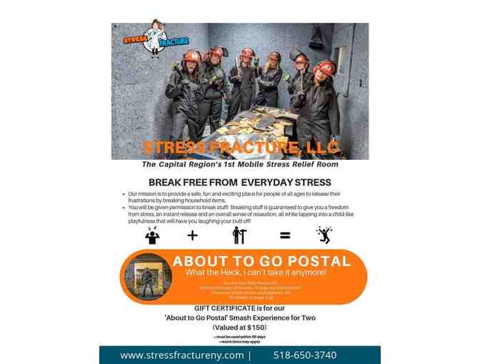 Don’t go postal! Let Stress Fracture give you the stress relief that you need! This package includes a Smash Experience for 2! You will be given the permission to break stuff! This gives you the guaranteed freedom from stress, and instant release and an overall sense of relaxation, all while tapping into a child-like playfulness that will have you laughing your butt off!