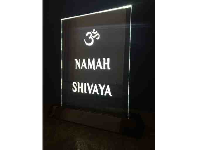 This exquisite, engraved, lighted, glass Om Namah Shivaya free standing piece of art is sure to light up any space.