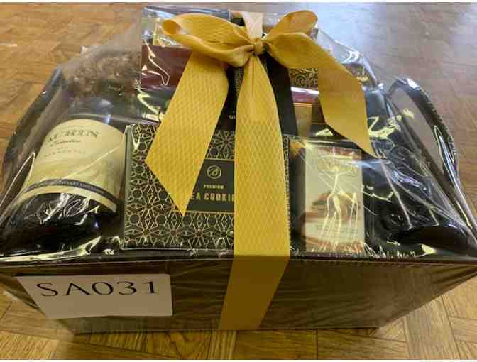 Enjoy this delicious basket filled with assorted chocolates, cookies, and crackers, along with 2 bottles of wine.