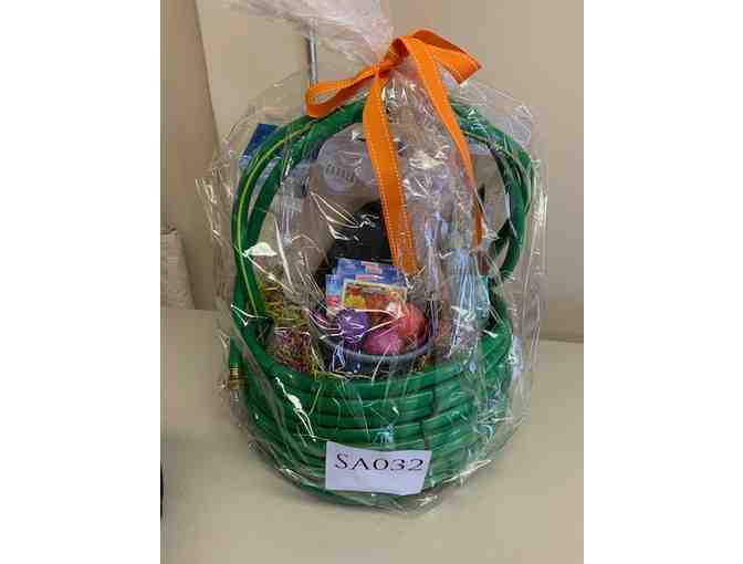 Show off your green thumb with this awesome gardening basket: garden hose, potting soil, planter, assorted seeds and seed bombs, gloves, plant markers, and handheld gardening tools.
