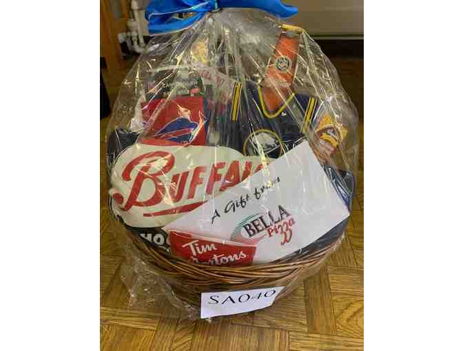 Show your Buffalove out and about with this great basket which includes: a Buffalo Hockey Club hooded sweatshirt, 999 Broadway wine, Crystal Beach Loganberry, 8oz. Milk Chocolate sponge candy, Sabres bottle jersey, a pair of Buffalove wine glasses, $20 gift certificate to Bella Pizza, $10 gift certificate to Tim Horton's, and magnet set.