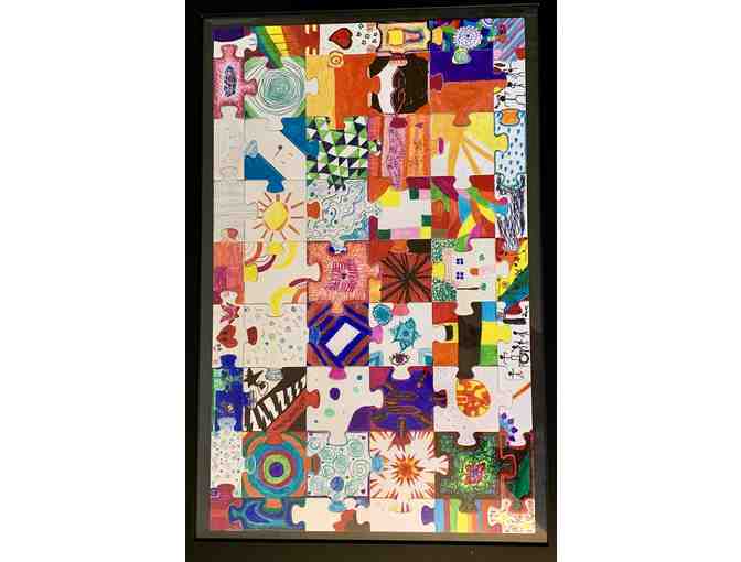 Colorful puzzle made by the 5th graders! Framed and ready to hang on your wall.