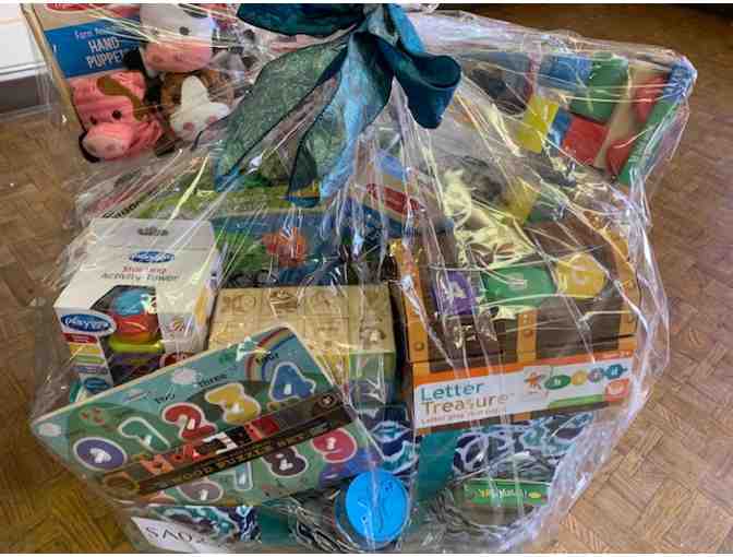 This basket is perfect for anyone with a little one in their lives! Comes complete with an assortment of Melissa and Doug toys, foam and wooden puzzles, sensory balls, PlayGro activity tower, ABC flashcards, Barrel of Monkeys, and I Spy card game- all packed into a convenient storage tote.