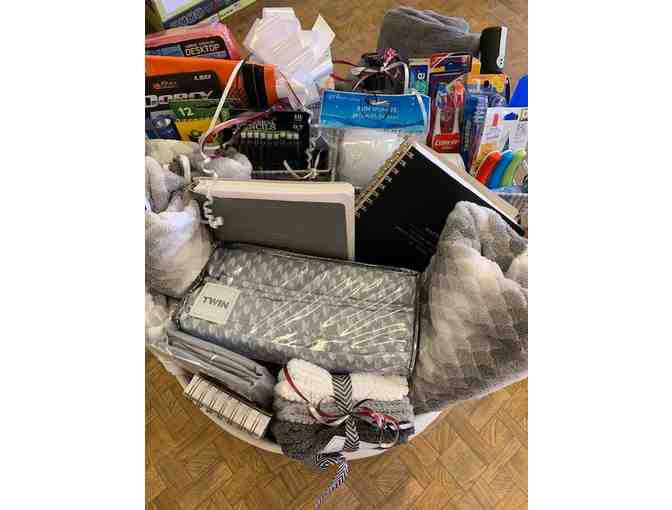 Just in time for High School graduations! This basket has everything your College- bound student needs (except the answers to the tests): sheets, blanket, pillow, assorted toiletries, notebooks, calculator, assorted pens and pencils, umbrella, first aid kit, and a flashlight fill out this jumbo hamper.
