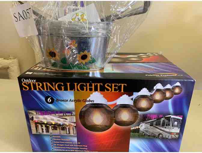 Just in time for spring. This basket comes with a $50 Lockwood's Greenhouse gift certificate, nitrile gardening gloves, hand tools, and a set of beautiful bronze acrylic globe lights.