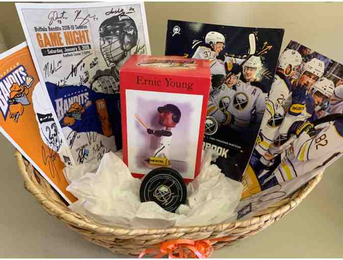 Round out your Buffalo sports collection with these keepsakes: Buffalo Bandits game program autographed by #23 Steve Priolo, Buffalo Sabres game program autographed by #10 Jacob Josefson, Buffalo Sabres hockey puck autographed by #55 Rasmus Ristolainen, autographed 2018-2019 Buffalo Sabres yearbook signed by #71 Evan Rodriguez, Team signed Buffalo Bandits game program, and a Buffalo Bisons Ernie Young bobblehead.