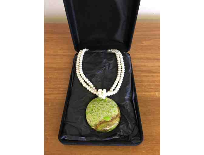 Check out htis beautiful double strand of pearls with a precious stone pendant.