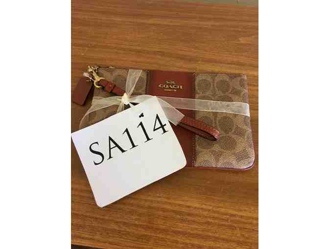 A perfect addition to any purse collection: a beautiful multi-toned brown Coach wristlet.