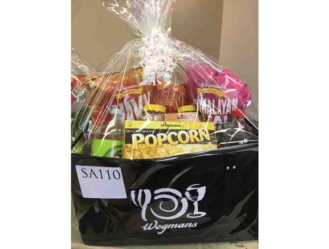 Everything is in this basket for a picnic! Complete with chips, popcorn, soda, pretzels, peanuts and more- and a $25 Wegmans gift card- all in this sturdy tote.