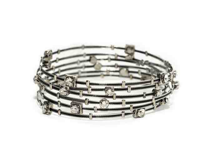 Stainless steel wire bangles embellished with metal stantions and clear Swarovski crystals. Set of 6. By Seasonal Whispers, handmade in Tribeca.