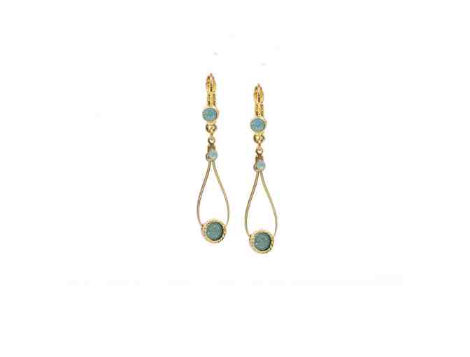 24kt gold plated wire, lever-back earrings embellished with Swarovski opal turquois beads. By Seasonal Whispers, handmade in Tribeca.