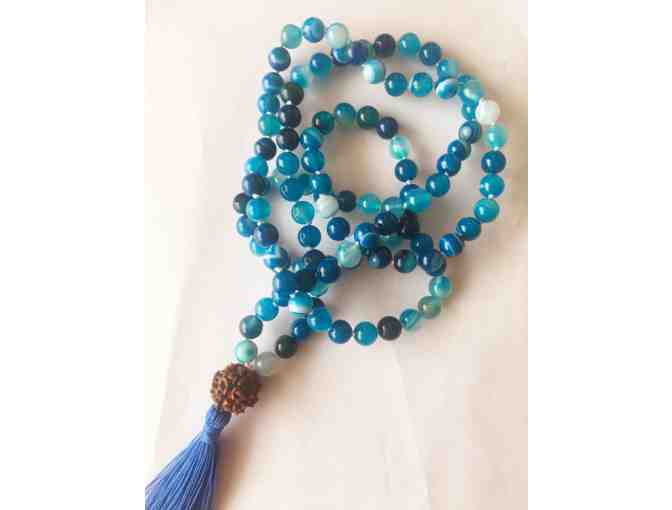 This elegant, one-of-a-kind 108 Japa Mala with 8mm Stripped Blue Agate beads hand-knotted with white thread, finished with a Babaji Guru bead and handmade blue tassel.
