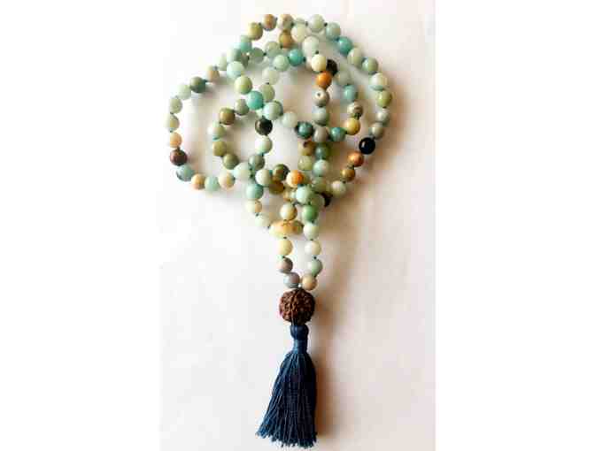 This elegant, one-of-a-kind 108 Japa Mala with 8mm Amazonite beads hand-knotted with turquoise thread, finished with a Babaji Guru bead and handmade steel blue colored tassel.
