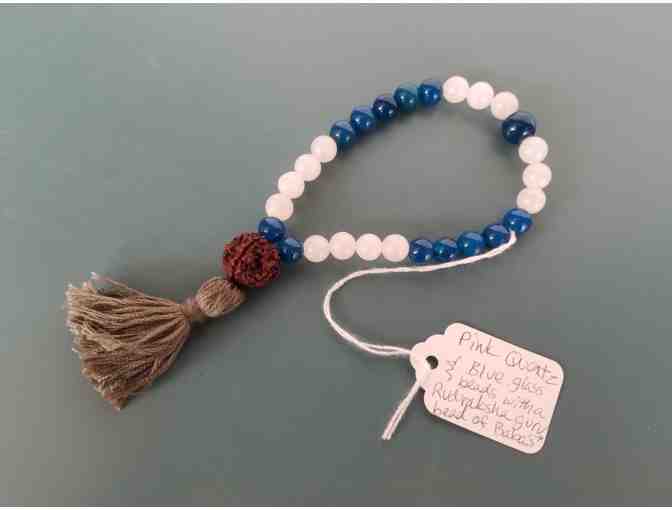 A Wrist Mala with Rudraksha Bead from Shri Babaji's Mala w/ Pink Quartz and Blue Glass