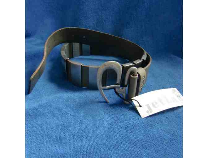 Approximately 38" long, 1.5" wide, this belt features distressed olive colored leather, industrial matte silver tone details, and a truly unique buckle. Limited edition from JetLag.