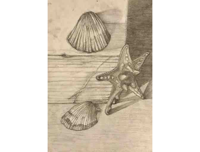 This extremely talented Millennium High School student drew the objects (seashells and a starfish) in this still-life drawing to represent a beach theme. The title of the drawing is "Beach." Size unframed: 12X18. Size framed: 15X21. The student donated her art to the online auction as she is proud to support her high school.