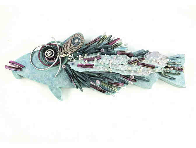 This is my 1st year participating in the Marblehead Arts Association Festival of Cods. "Bedazzled Cod Dashian" is fashioned after my other creations except I went a little overboard like a Kardashian getting dressed up for a magnificent event, which this one is! My fun began each time I collected a piece of driftwood on the beach while walking my dog, Stella. I knew that I wanted to someday create something unique and original with that found wood. I knew I wanted to make designs to make people happy. My creative juices overflowed every time I looked at the form and texture of those weathered pieces. I yearned for a creative outlet, a sort of a beach therapy. Bedazzled Fish was born in 2017 when I found a friend rummaging thru a box of old jewelry, buttons and beads, and then realized, I could incorporate those items onto the driftwood. My yearning was satisfied when I found joy in making and selling those whimsical creations. I am blessed to share that joy with those who enjoy my work. I am blessed that I have met my goal and found an outlet to make myself and others happy.