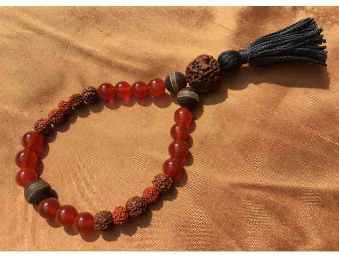 This wonderful wrist mala is made with a rudraksha bead from Shri Babaji's personal mala. The rest is made with Carnelian and Agate Beads w/Babaji's Rudraksha Bead This is strung on elastic to fit any wrist. It has 27 beads plus a rudraksha Guru bead. To wear Babaji's sacred rudraksha bead, which are becoming very rare, around your wrist is a great blessing.