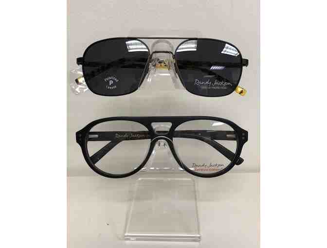 Stand out from the crowd with the on-trend appeal of the Randy Jackson Limited Edition X138 eyewear set in matte black. This plastic aviator with a keyhole bridge cutout and metal rivets boasts a stylish and masculine look that flatters a variety of men's faces. Comfort fit features include spring hinges that provide for easy adjustments and the ability to accommodate progressives. Also included are a pair of stylish aviator sunglasses with polarized lenses that offer full UV protection and can accommodate prescription lenses.