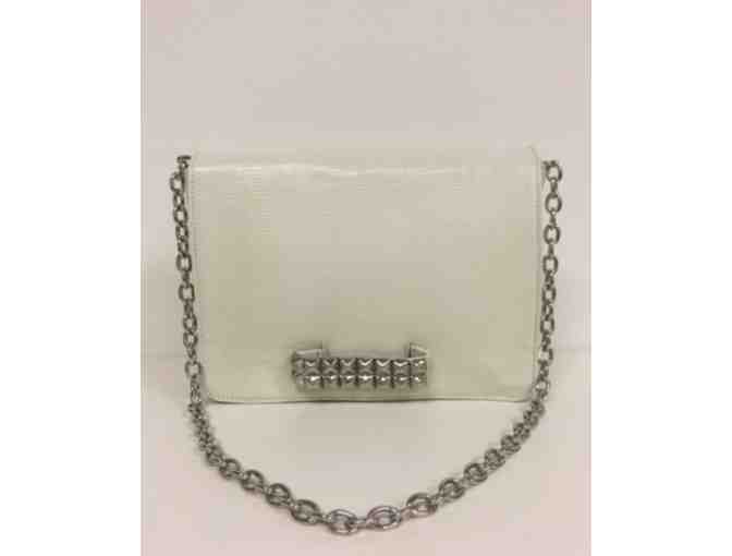 This chic and modern white clutch from EYE Thread will easily become your favorite handbag. Luxurious white textured leather accented with a sleek silver chain makes this clutch the perfect complement to your wardrobe. The front handle with metal detailing makes this bag both functional and fashionable. This outstanding handbag will be a terrific addition to your collection.