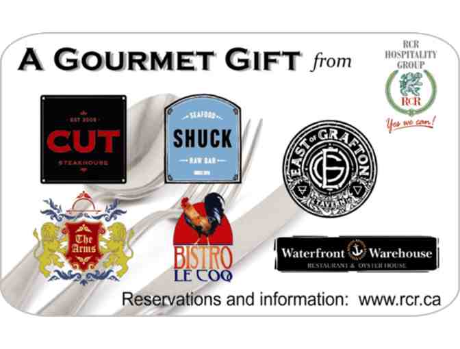 The RCR Hospitality Group offers a selection of casual to fine dining with six fantastic restaurants in downtown Halifax. Choose from the French-style Bistro Le Coq, the award winning CUT Steakhouse, the new seafood sensation Shuck Seafood & Raw Bar, the casually eclectic tavern, East of Grafton, the Nova Scotia seafood tradition of the Waterfront Warehouse, or The Arms gastro house located in the historic landmark Lord Nelson Hotel and Suites. Your gift card is good at all RCR restaurants.