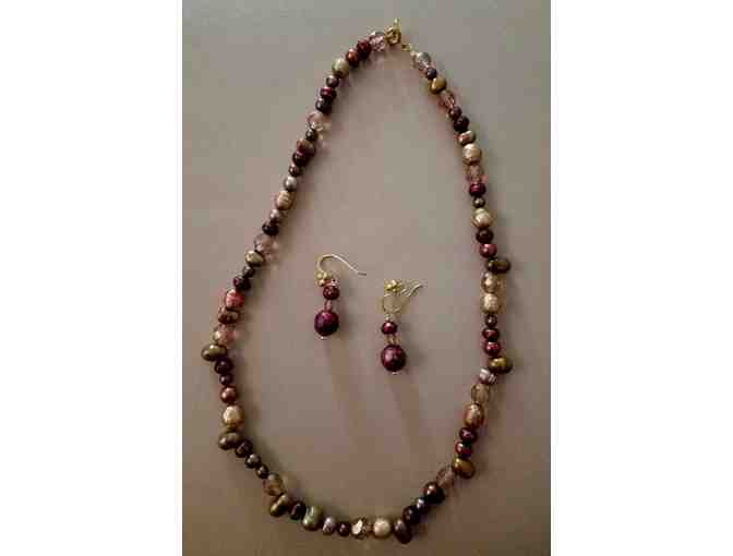 Necklace and earring set - has an alternating large metal of a coppery color and off-white beads, Sharon describes it as “pressed metal and glass beads with freshwater pearls."