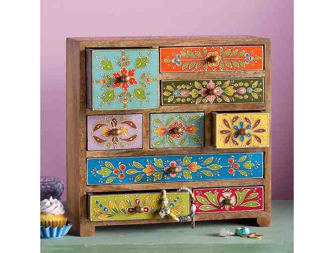 A beautiful piece to house your greatest treasures! Against a backdrop of rustic wood, handpainted drawers bloom with color and flowers providing an artful home for jewelry and loved mementos.