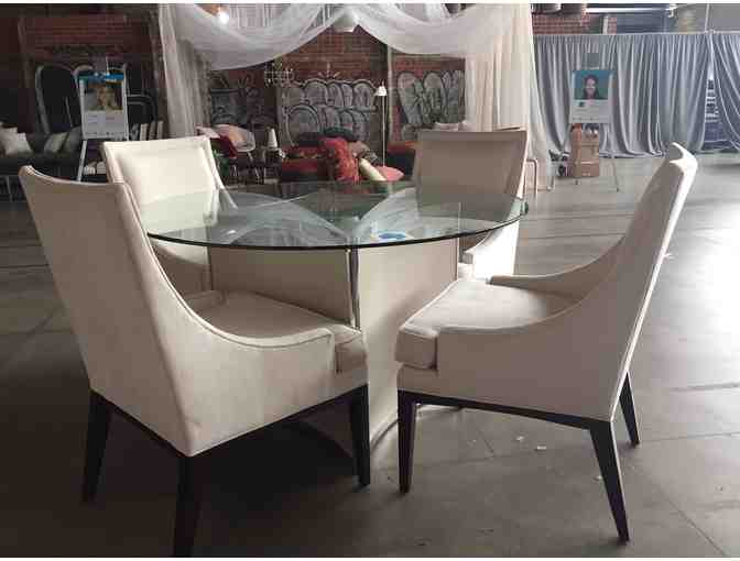 4 x Upholstered straight back dining Brilliance ivory chairs with acrylic legs 1 x Round top dining table on curved diamond shape base, cream/metal/glass, 54"D glass top