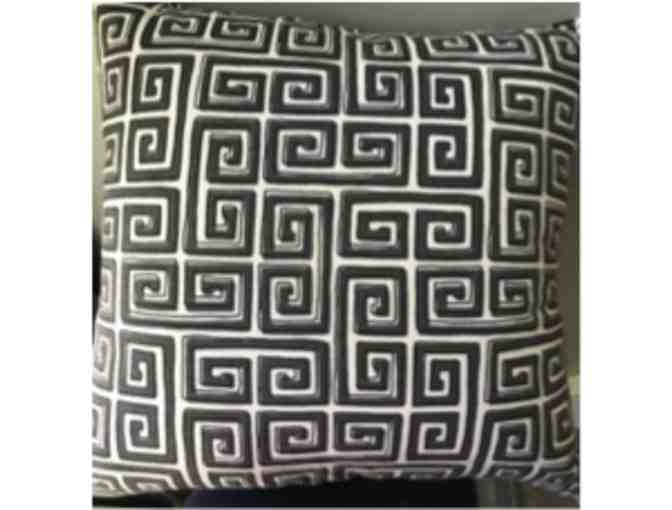 Custom self-piped throw pillow with a Greek key pattern