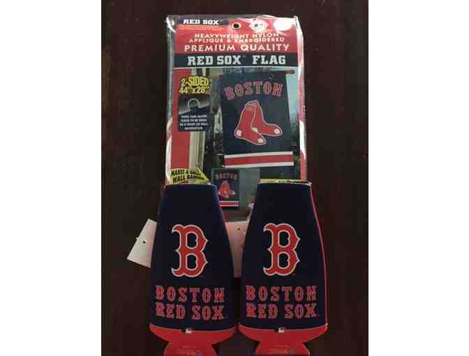 Show your Red Sox spirit with this flag and two coolie huggers for your drinks. The flag is 44" x 28" heavy weight nylon applique & embroidered on both sides. Also makes a great wall banner!