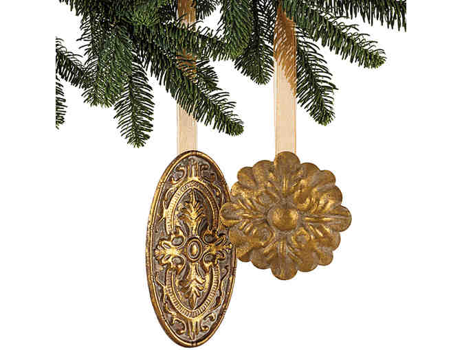 Medallion designs are wonderfully detailed and crafted in pressed metal with an antiqued-gold finish. Each one hangs from a sheer organza ribbon. 4"w x 7¾"h and 5¼" dia.